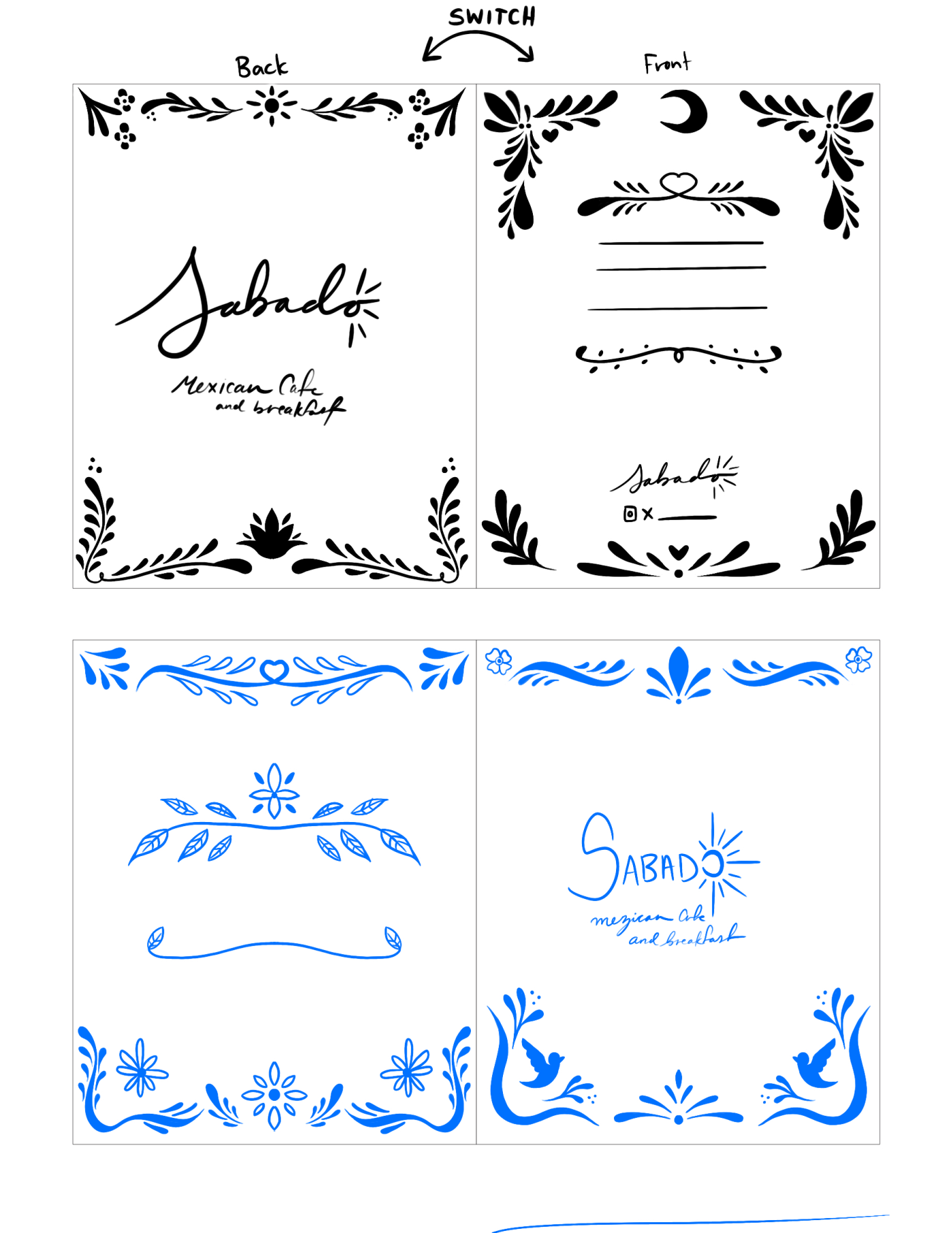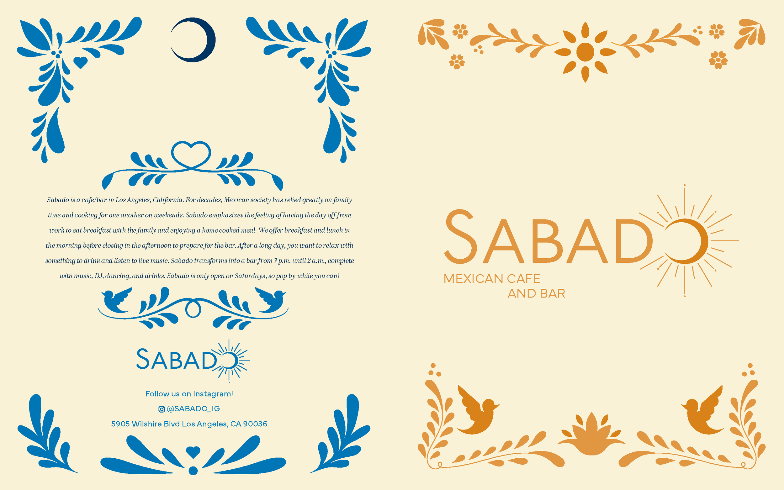 Sabado is a menu and branding project inspired by Mexican culture. The design uses a high-contrast color scheme to organize the restaurant’s different services: orange for the breakfast menu and blue for the bar. This system makes the menu easy to navigate and creates a clear visual distinction between the morning and evening offerings while keeping the overall brand consistent. All the illustrations were inspired by Mexican talaveras. Menu was designed using procreate and illustration.